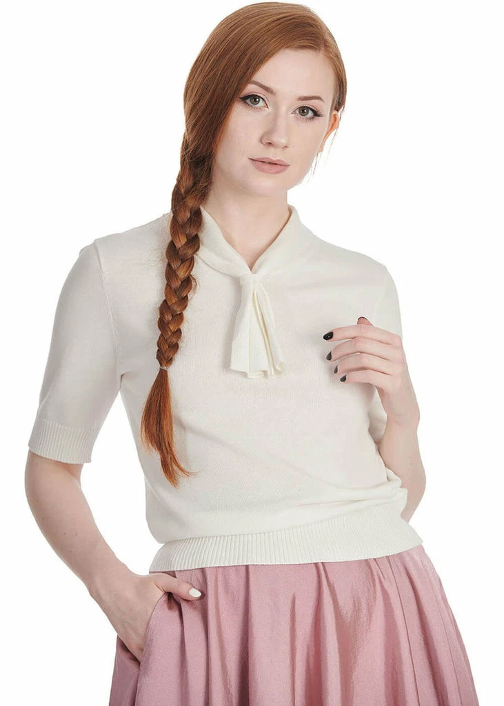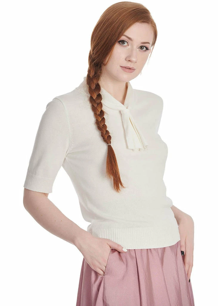 Her charming scarf detail makes you visualize countless outfits immediately: The ribbed edges on the bottom and sleeve ends make her the perfect jumper to match with all your 40s and 50s skirts….anytime really!