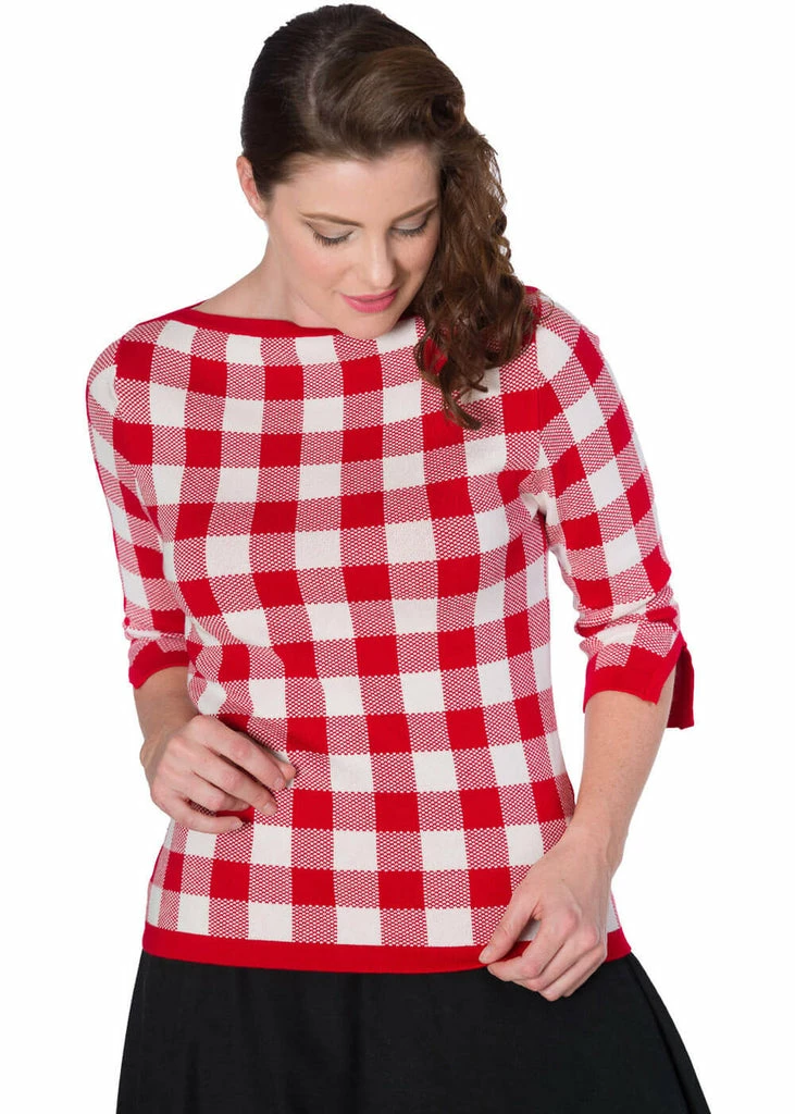 With Check Me, we can also enjoy this happy pattern on colder days, because her mix of viscose and nylon makes her so incredibly cozy. The little v’s at the half long sleeves are a playful wink, and she has a wide neck. This beauty is long enough to be worn above trousers, but can also go lovely with a high waist skirt or trousers.