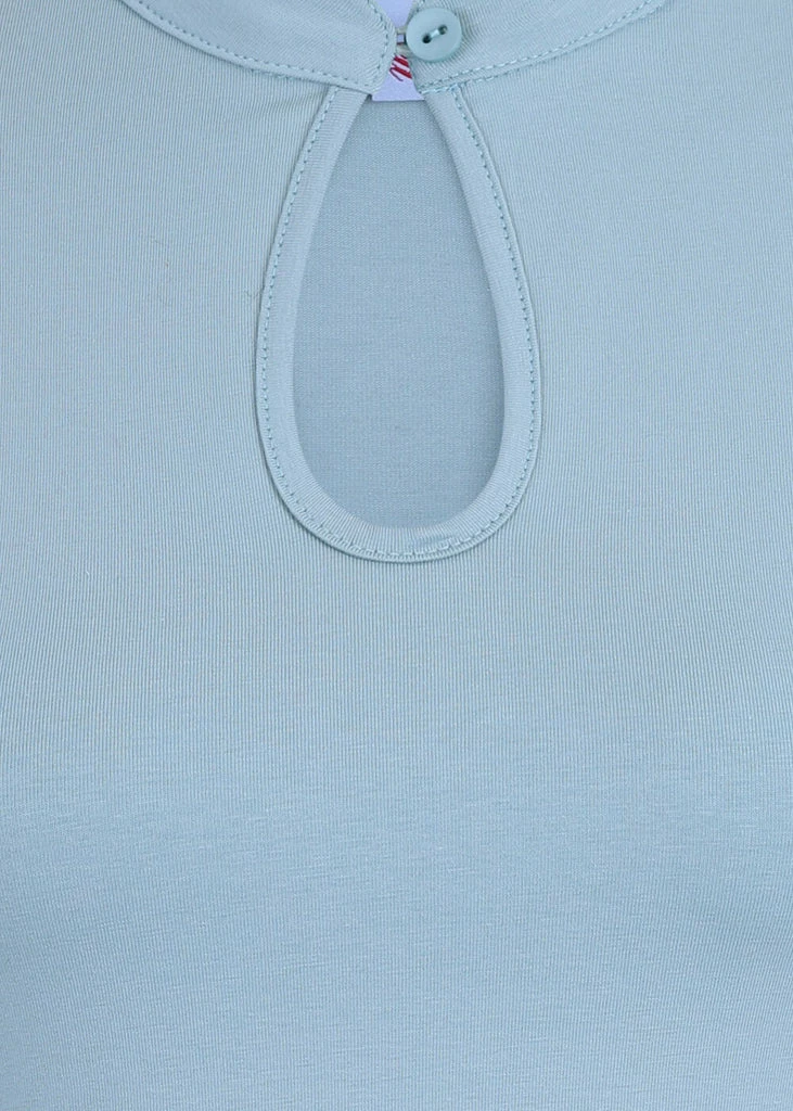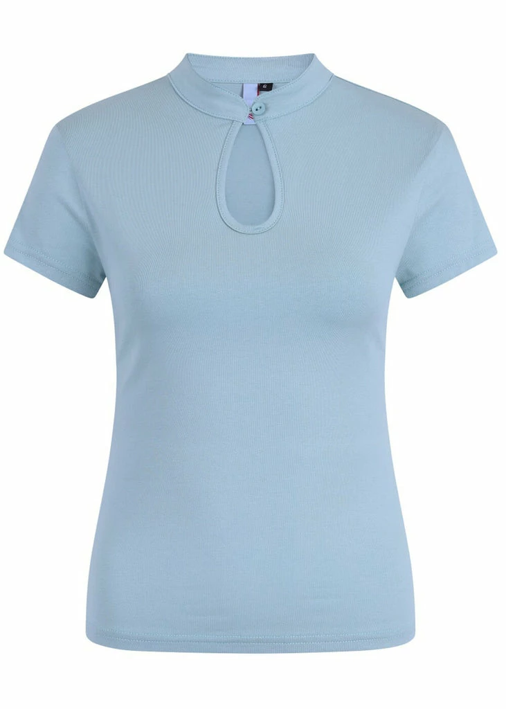 That’s Mandarin. This lovely stretchy basic has a playful key-hole, which opens and closes with a button. Her collar elegantly sits up straight for a chic classy fit. She is long enough to be worn with normal trousers, but is ofcourse super cute to combine with some high waisted trousers or skirts!