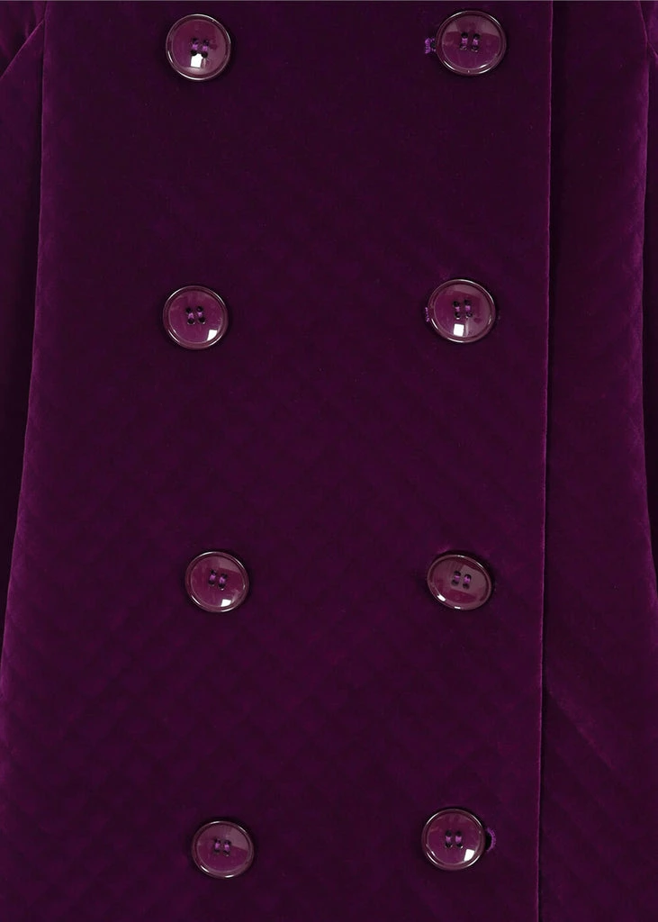 The name says it all, this beautiful coat is made of a tough velvet that is stitched al the way true so a diamond pattern arises. The purple velvet gives a mysterious look, irresistible and the hood is makes this coat even more special! She has two rows of buttons, deep pockets and is lined.